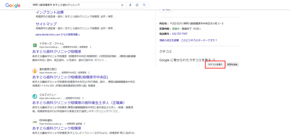 画面を下にスクロールし、[クチコミを書く]をクリックします。または、ビジネスプロフィールの「Googleのクチコミ(○○件)」をクリックするとレビューの一覧が表示されます。その右上の「クチコミを書く」ボタンをクリックすると、同じように投稿記入画面に進むことができます。