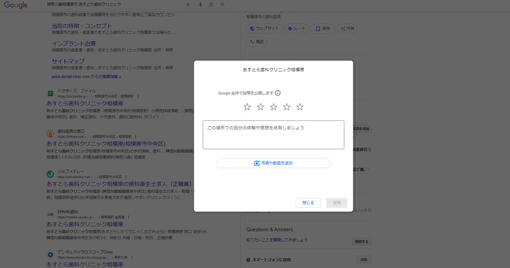 クチコミの入力フォームがポップアップするので、クチコミを書いたり写真をアップロードする。