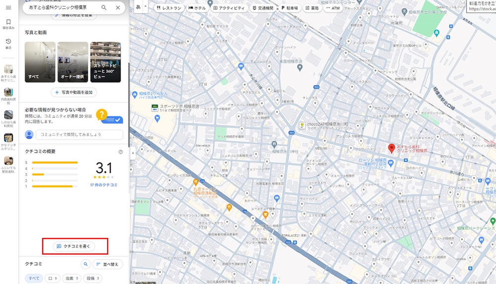 ビジネス情報が表示されたら、左側のパネルを下にスクロールし、「クチコミを書く」ボタンをクリックします。