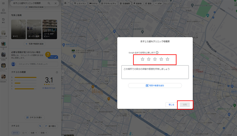 ログインすると、星評価を付けたり、説明を加えたり、写真をアップロードしたりできる入力フォームが表示されます。記入し終わったら「投稿」ボタンをクリックします。