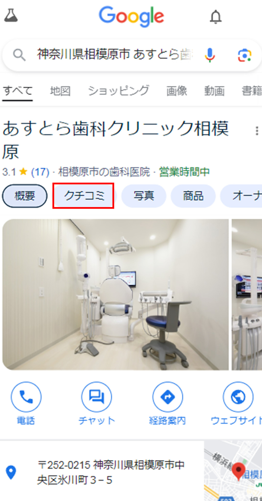 クチコミにページに移動:ビジネスプロフィールページを下にスクロールして、「クチコミ」タブをタップする。